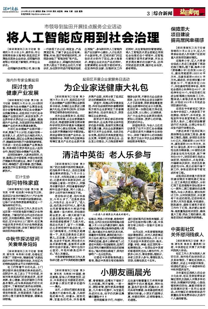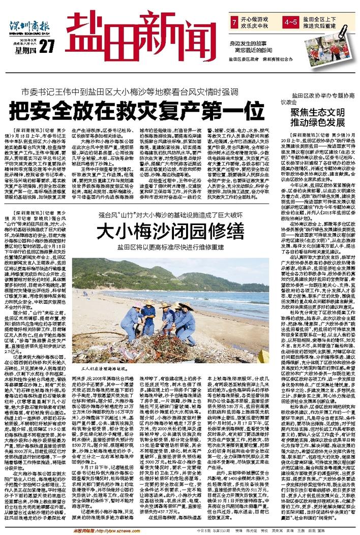 【深圳商报讯】(见习记者 黎晓欣)强台风“山竹”过后,盐田区海滨栈道损坏严重,原本洁净的栈道也到处充斥着树枝、树叶、碎玻璃等垃圾。9月19日下午,区委书记杜玲率区几套班子领导走上街头,开展